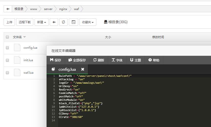 打開面板的文件管理,進入 /www/server/nginx/waf 目錄,里面的 config.lua 文件就是防火墻的配置文件。每一項的具體含義如下所示: