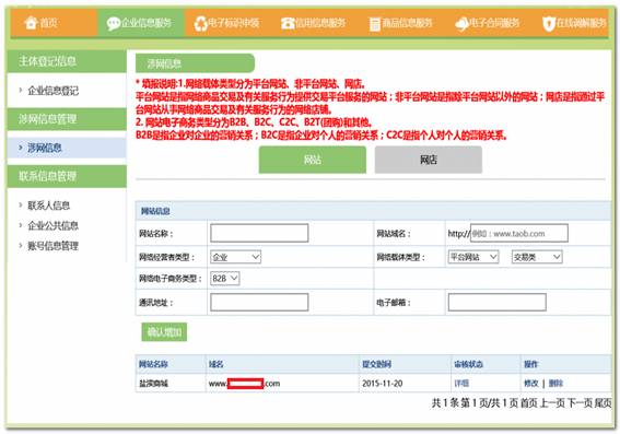 企業(yè)主體可對(duì)其開辦的網(wǎng)店或網(wǎng)站進(jìn)行管理涉網(wǎng)信息登記,如下所示: