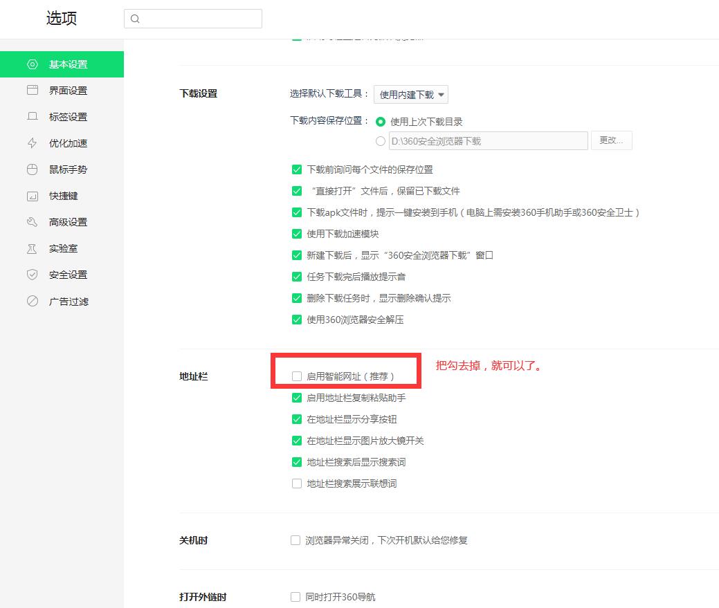 2、點(diǎn)開設(shè)置默認(rèn)是基本設(shè)置,然后拉到底,找到“啟用智能網(wǎng)址"這個(gè)選項(xiàng),把勾去掉,就可以了。