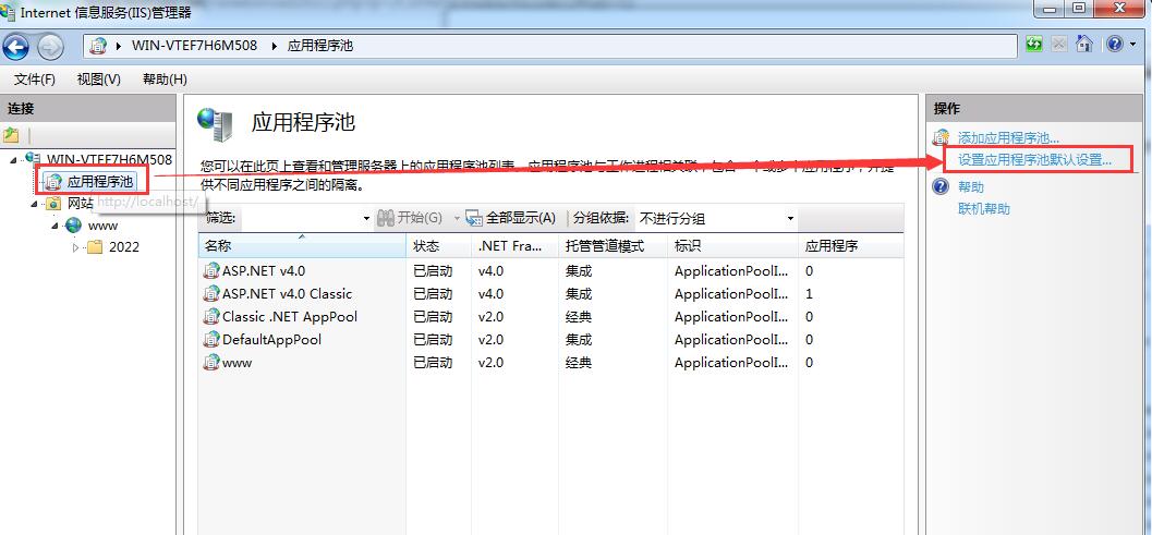 經(jīng)查找問題出在:程序池配置上,如下圖: