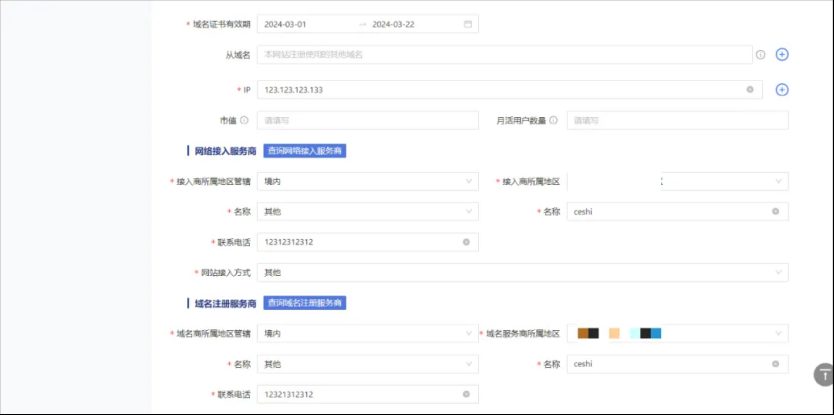 根據(jù)頁(yè)面提示完成信息填寫(xiě),包括網(wǎng)站名稱(chēng)、是否有工信部備案號(hào)、網(wǎng)站開(kāi)通日期、域名信息、服務(wù)器IP地址、網(wǎng)絡(luò)接入服務(wù)商和域名注冊(cè)服務(wù)商信息、網(wǎng)站服務(wù)類(lèi)型(是否涉及管制信息發(fā)布)、相關(guān)前置許可選擇、網(wǎng)站語(yǔ)種選擇等,注意填寫(xiě)網(wǎng)站全稱(chēng)及主域名,需要上傳域名證書(shū)電子檔,IP地址是指公網(wǎng)IP,不要填寫(xiě)內(nèi)網(wǎng)IP。